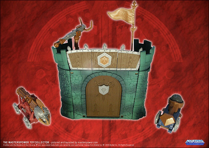 Im Stil des Gastle-Grayskull Designs kommt die Battle Station, welche am Playset an der Rückseite mit Clips angebracht werden kann. Mit dabei sind Geschosse, Raketen, Felsblock-Katapult und Rammbock.